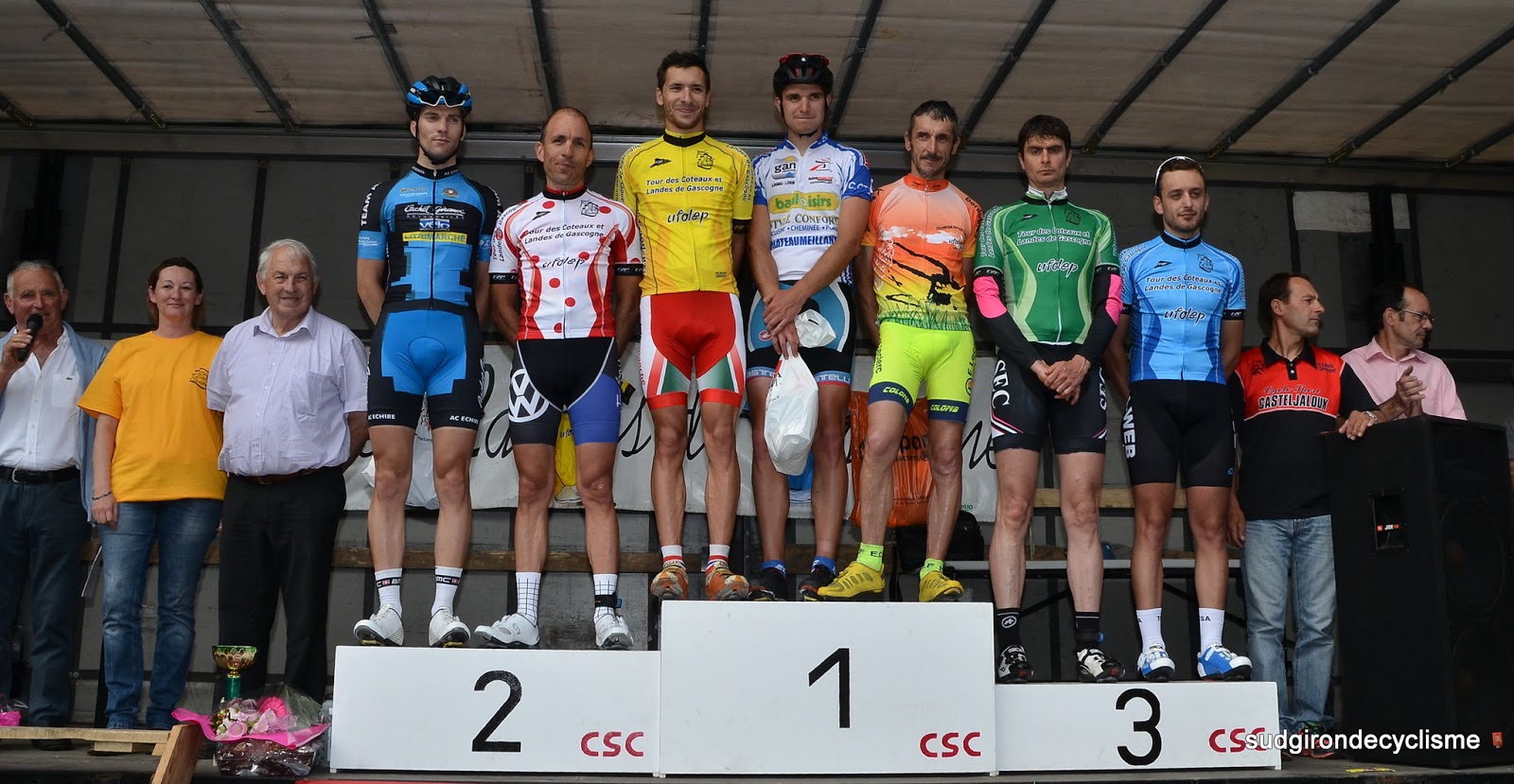 Protocole ci dessous avec Monsieur le Maire de Casteljaloux , Matthieu Toffoletti (plus combattif) , Alexandre Léon (meilleur grimpeur) , Florian Luquet (maillot jaune) , François Bardary (fair play) , Thierry Delmonteil (km 47) , Loic Lepoutre (sprinter) et Julien Trochut (1er des 2éme catégorie) .