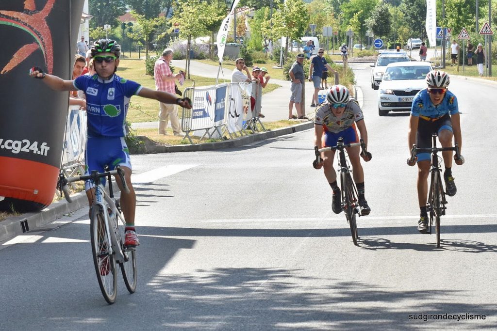 Lors du sprint final à 3, Baptiste Revello (CD du Tarn), pourtant pas le plus rapide, attaquait de loin et ne fut pas inquiété pour remporter sa 1ére victoire 2016.