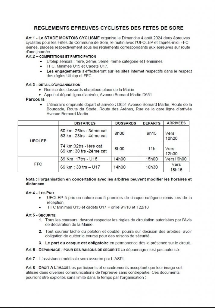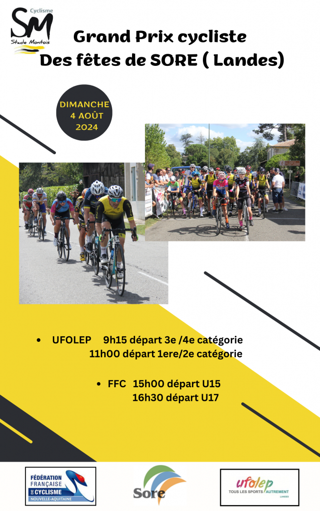 « Le Stade Montois cyclisme organisera le grand prix cycliste des Fêtes de SORE , le matin courses Ufolep départ à 9h15 pour les 3eet 4e catégorie, départ à 11h pour les 1ere et 2e cat.«