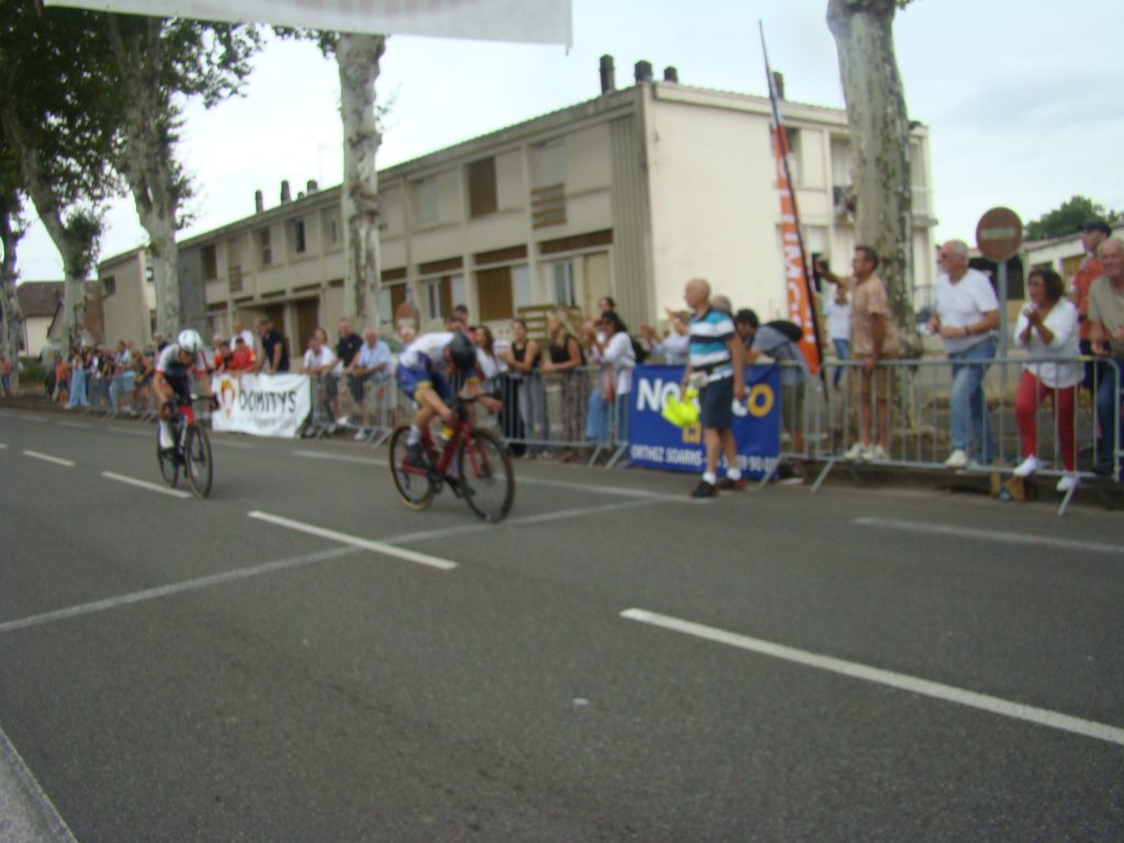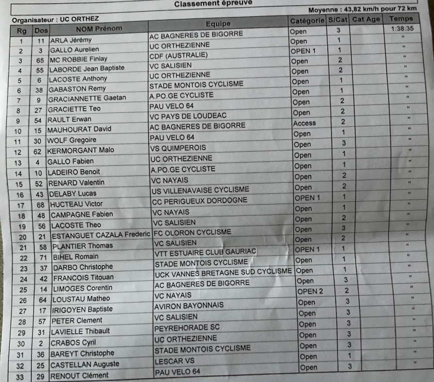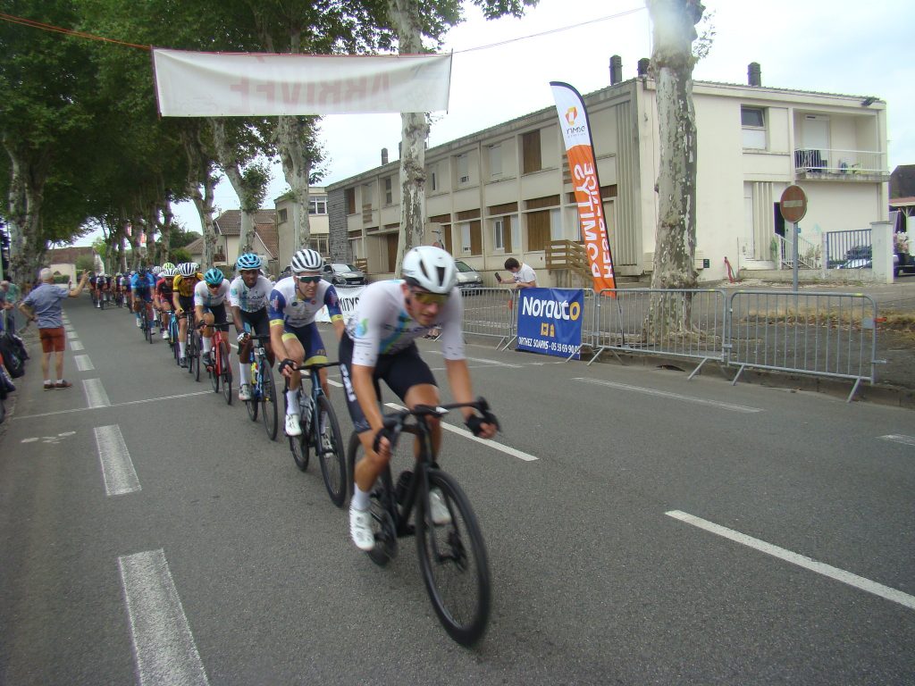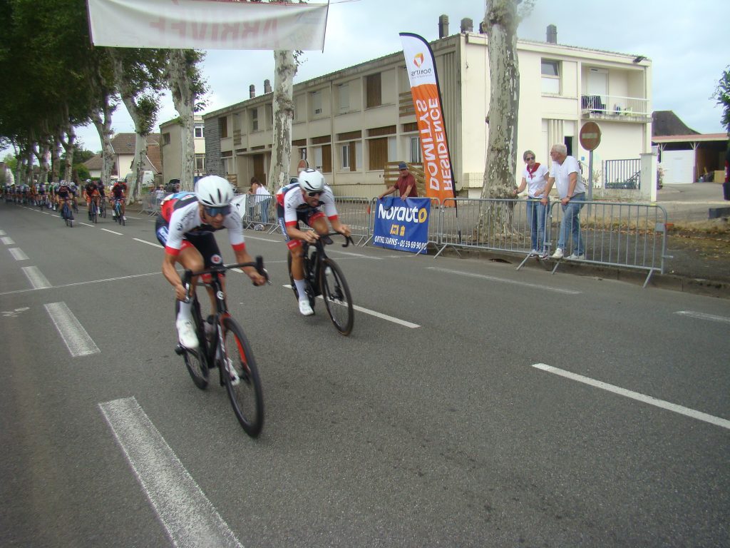 Le départ ultra rapide voulu par le Palois Grégoire Wolf montre qu’on ne chômera pas sur le circuit orthézien relativement plat. D’ailleurs dans la 1è heure 43,200 km sont couverts. Dans ces conditions, il est difficile de former une échappée digne de ce nom. Benoit Ladeiro (Apoge) tente sa chance suivi de Bertrand Coumet (Bagnères), puis Malo Kermorgan (Quimper), avant Simon Dulout encore un Bagnérais. Décidément les Bagnérais se montrent beaucoup. Et si l’un d’eux tentait un coup ? Eh oui ! C’est Jérémy Arla qui s’y emploie. A Orthez on le connaît. Coureur complet, au mois d’avril, c’est lui qui gagne à Orthez la Béarnaise (course qui remplace le fameux Week end Béarnais) puis qui s’impose à Arette dans un contre la montre. Il est également connu même si c’est sa 1è année de compétition officielle pour ses qualités de sprinter (2è à Lescar)