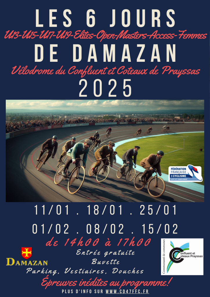 Damazan, le paradis des cyclistes ! Chaque année, en janvier, le vélodrome de Damazan devient le terrain de jeu de nombreux cyclistes en quête de performance. Les 6 Jours de Damazan, une compétition unique en son genre, font leur grand retour les 11, 18, 25 janvier, 1er, 8 et 15 février 2025.