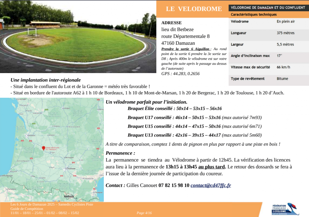 Avec ses 375 mètres de long et son inclinaison maximale de 17°, le vélodrome de Damazan offre des conditions d’entraînement optimales. Situé au cœur du Sud-Ouest en bordure de l’autoroute A62 (1h10 de Bordeaux, 1h20 de Toulouse, 1h20 de Bergerac, 1h20 d’Auch), il bénéficie d’un microclimat particulièrement favorable, limitant les annulations en raison des intempéries, avec une seule annulation météo en 9 ans ! Sa piste en bitume, plus exigeante que le bois, permet aux coureurs de développer la puissance et l’endurance spécifique aux routiers.