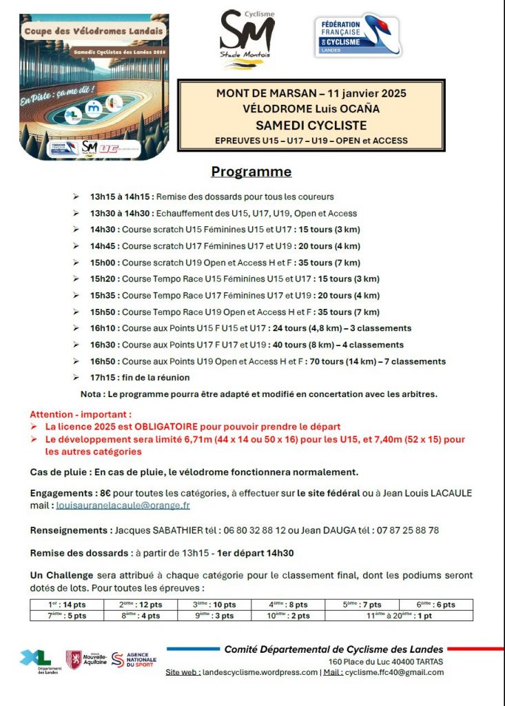 Le Stade Montois Cyclisme et l’Union Cycliste Aire Barcelonne, en coordination avec le Comité Départemental des Landes FFC organise ce samedi 11 janvier le 1er des Samedis Cyclistes des Landes.