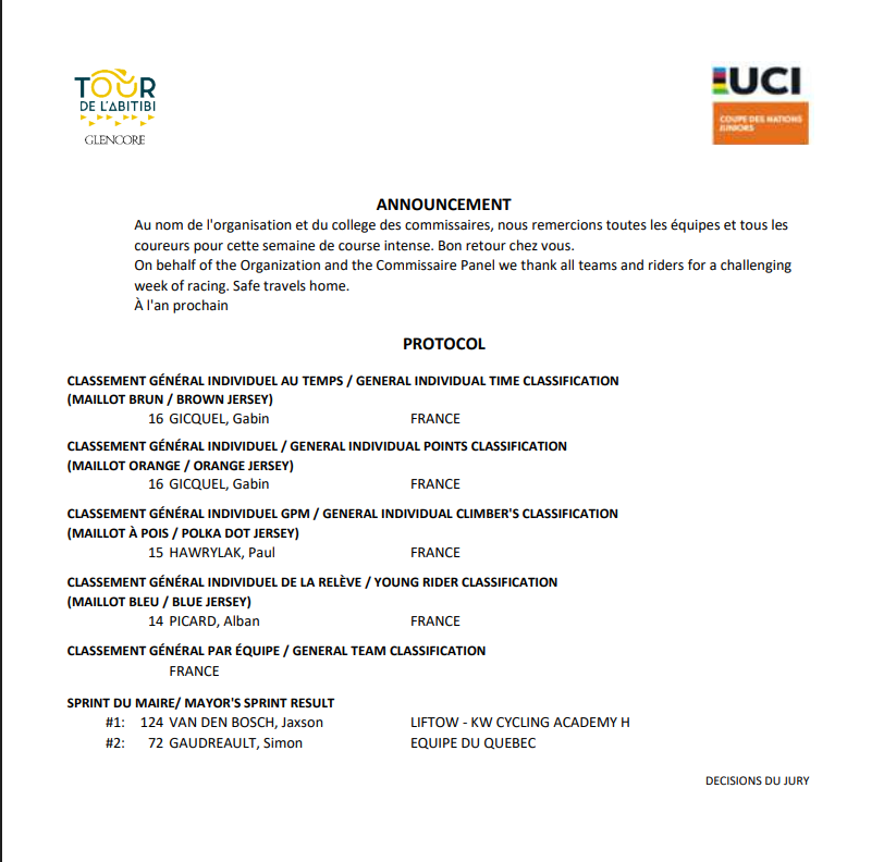 Toutes les infos en cliquant … ICI….https://www.rsstiming.com/Resultats/2025TourAbitibiHom.html
