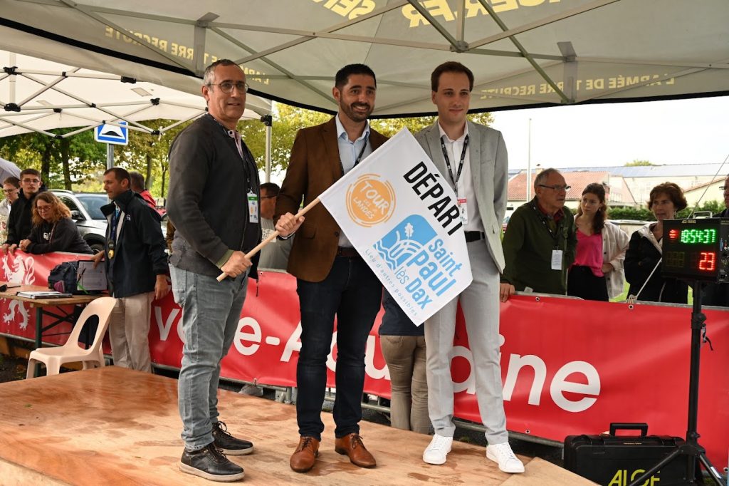 Départ du premier coureur avec Monsieur Julien Dazus maire et un de ses adjoints, Bastien Lamude président du Comité Département de cyclisme FFC
