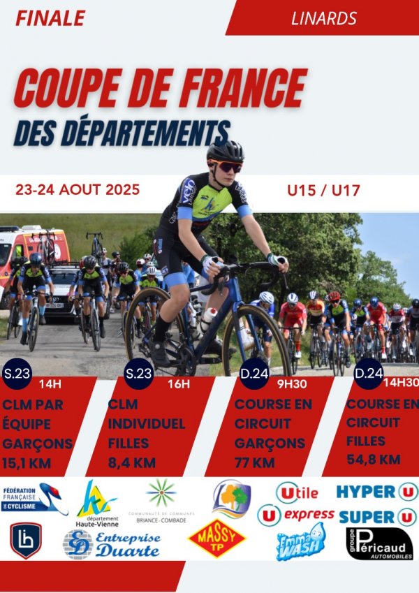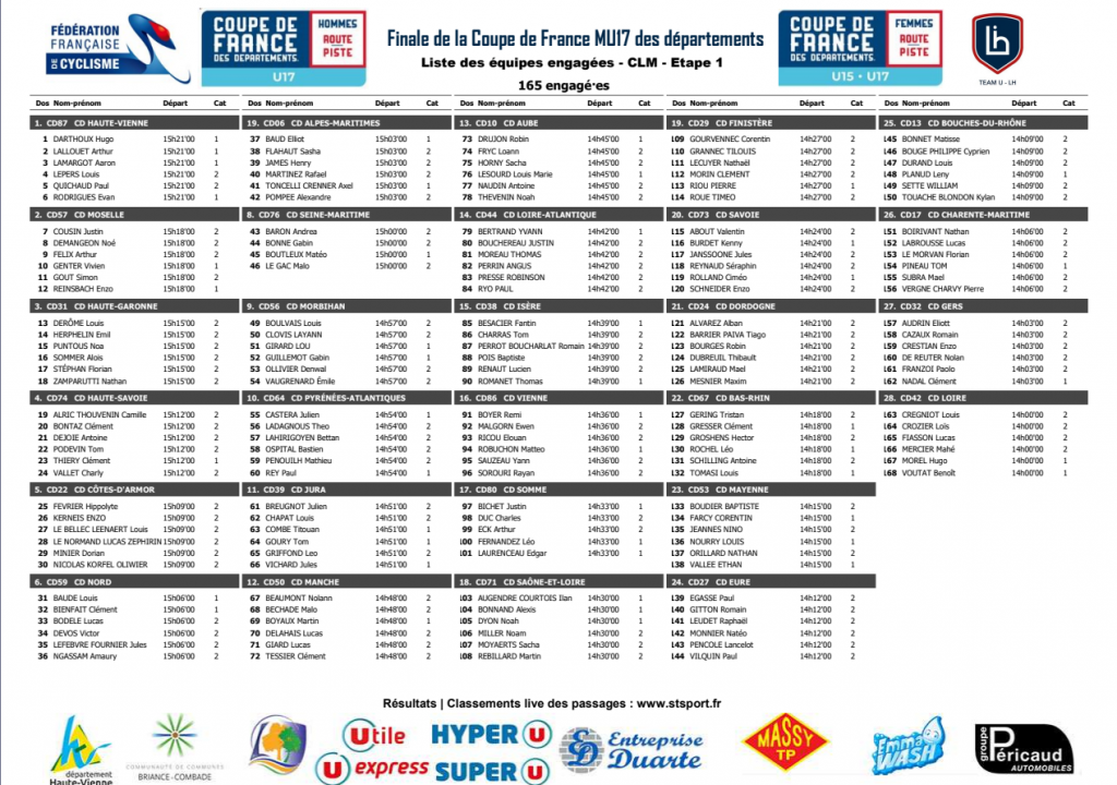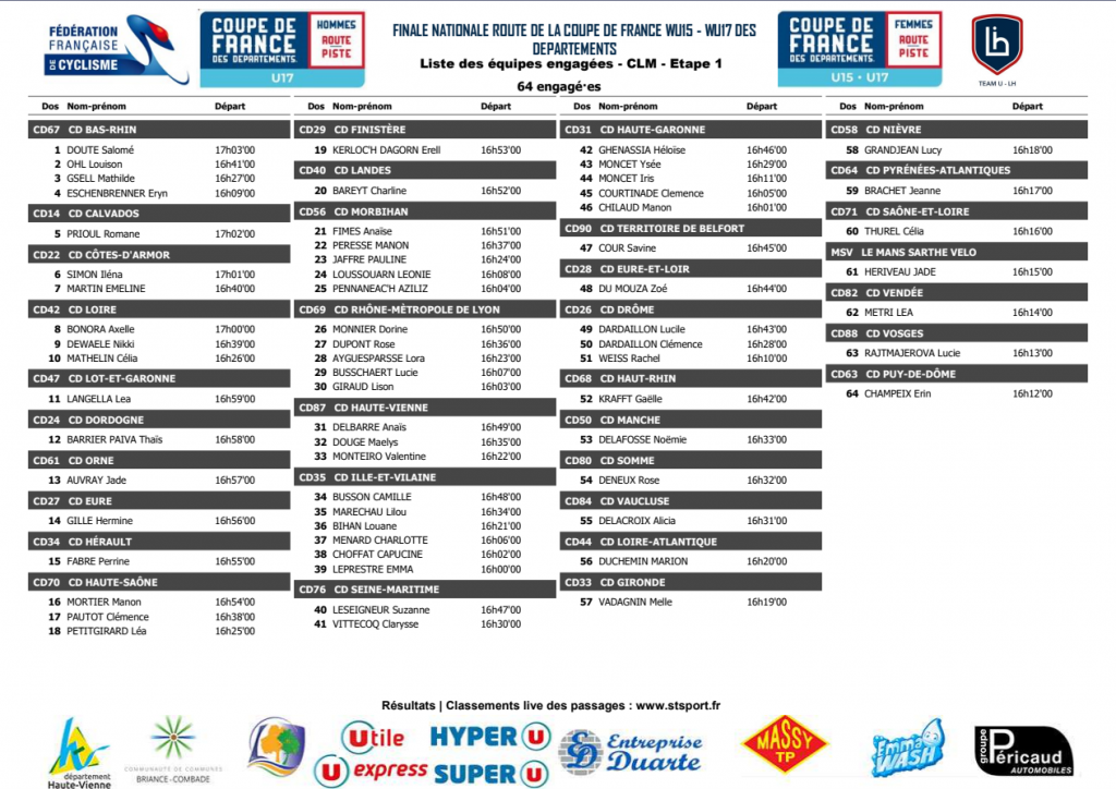 Engagé(e)s et heures départ CLM de la Coupe de France des départements à Linards (87)