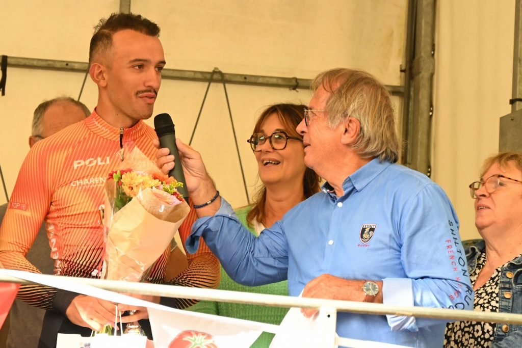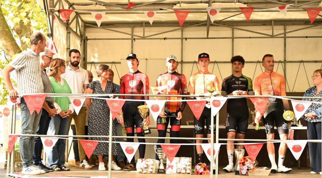 Ci-dessous protocole général aux côtés des élus, avec Paul Picard (2ème), Luca De Vincenzi (vainqueur, 1er du km 47, meilleur grimpeur), Matéo Loustau (3ème), Alban Picard (1er du CC Marmande) et Lilian Langella.