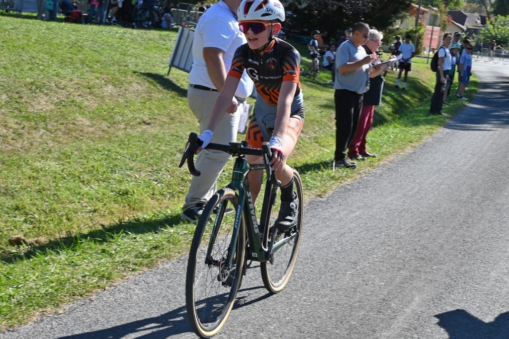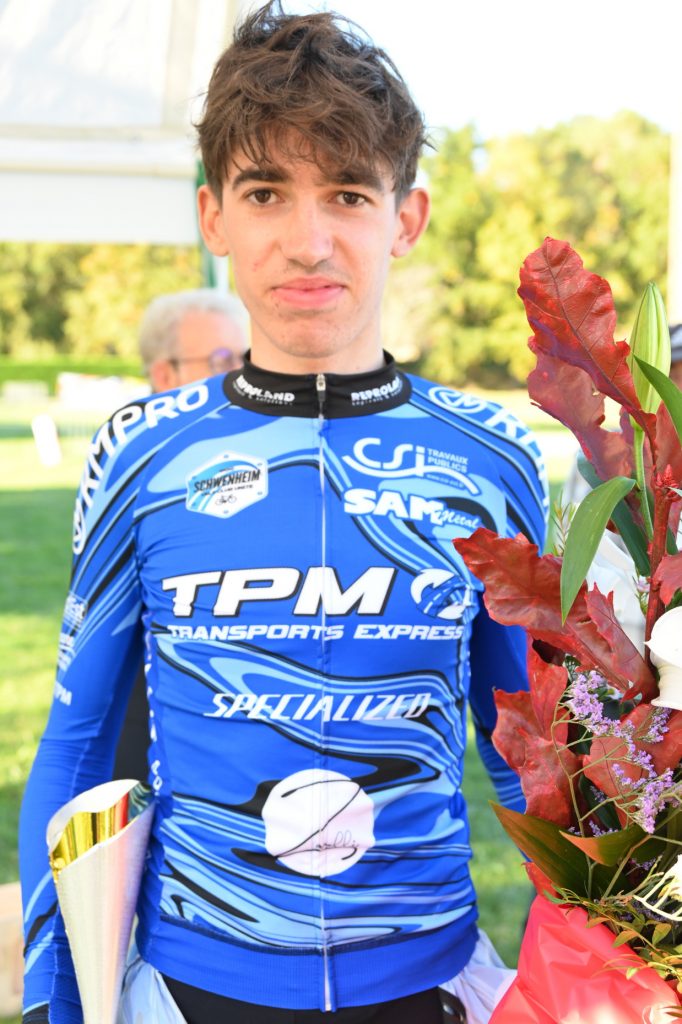 Baptiste Carrère (Team ULH) sous les couleurs de son Team Cyclo-Cross, 6ème du championnat de France , 27ème du dernier championnat du monde juniors s’impose au terme d’une course à rebondissements. Il succède à Mathieu Morichon 3 fois vainqueur ici-même.