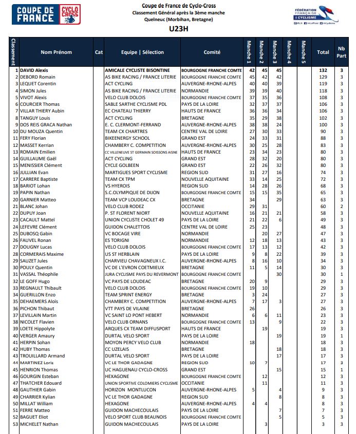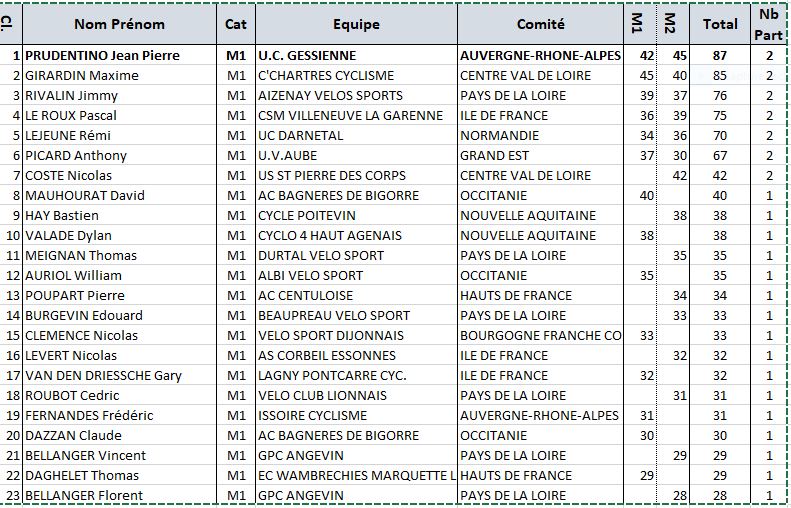 12 GAILLARD Florian AUVERGNE-RHONE-ALPES TEAM CROSS TECHNO CONCEPT URBALOC à 03’53 » 31
