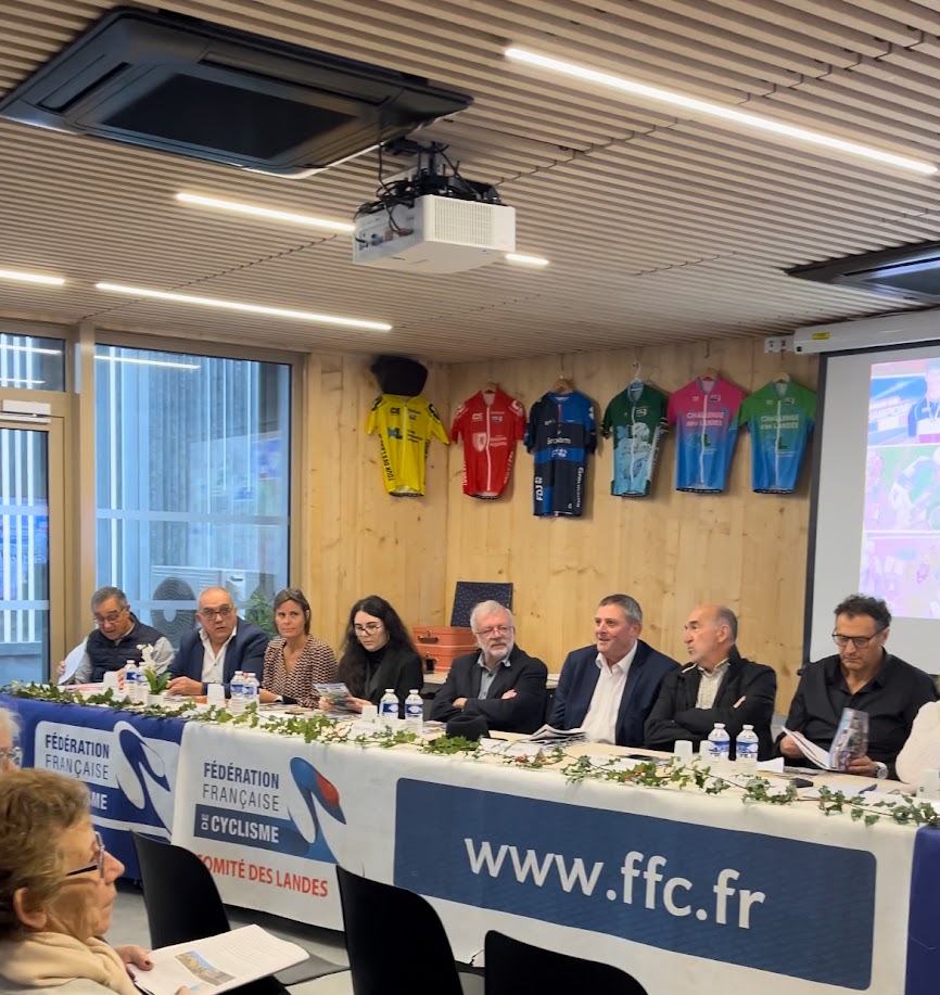 Dimanche 30 novembre se déroulait notre Assemblée Générale à la nouvelle Maison Départementale des Sports à Mont-de-Marsan, en présence de nombreux invités : Farid HÉBA (Adjoint aux sports de Mont-de-Marsan), Nelly BASOUIN (Cheffe de service adjointe au SDJES des Landes), Henri BEDAT (Vice-Président du Conseil Départemental en charge des sports), Alain BACHÉ (Conseiller Régional délégué), Sophie LAVAUD et Jean-Michel LABÈQUE (Secrétaire Générale et Trésorier Général du Comité Régional Nouvelle-Aquitaine de Cyclisme), Philippe CROSNIER (Président du CDOS des Landes), Michel GILBERT (Président du Comité des Pyrénées-Atlantiques de Cyclisme).