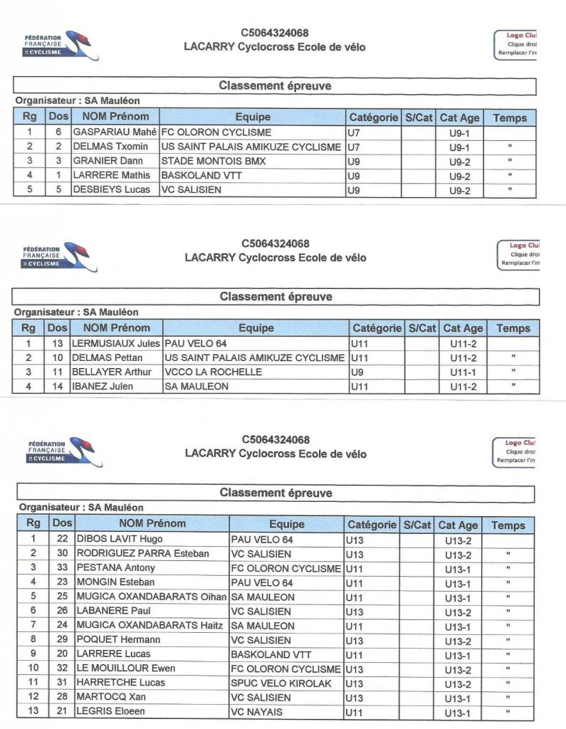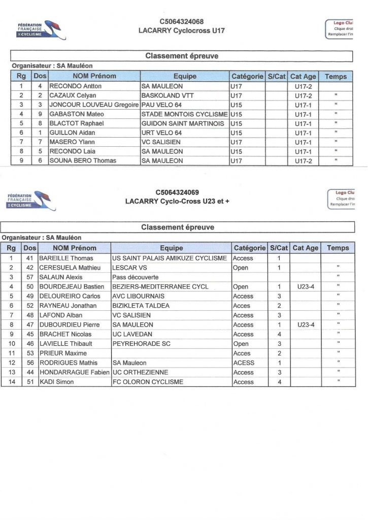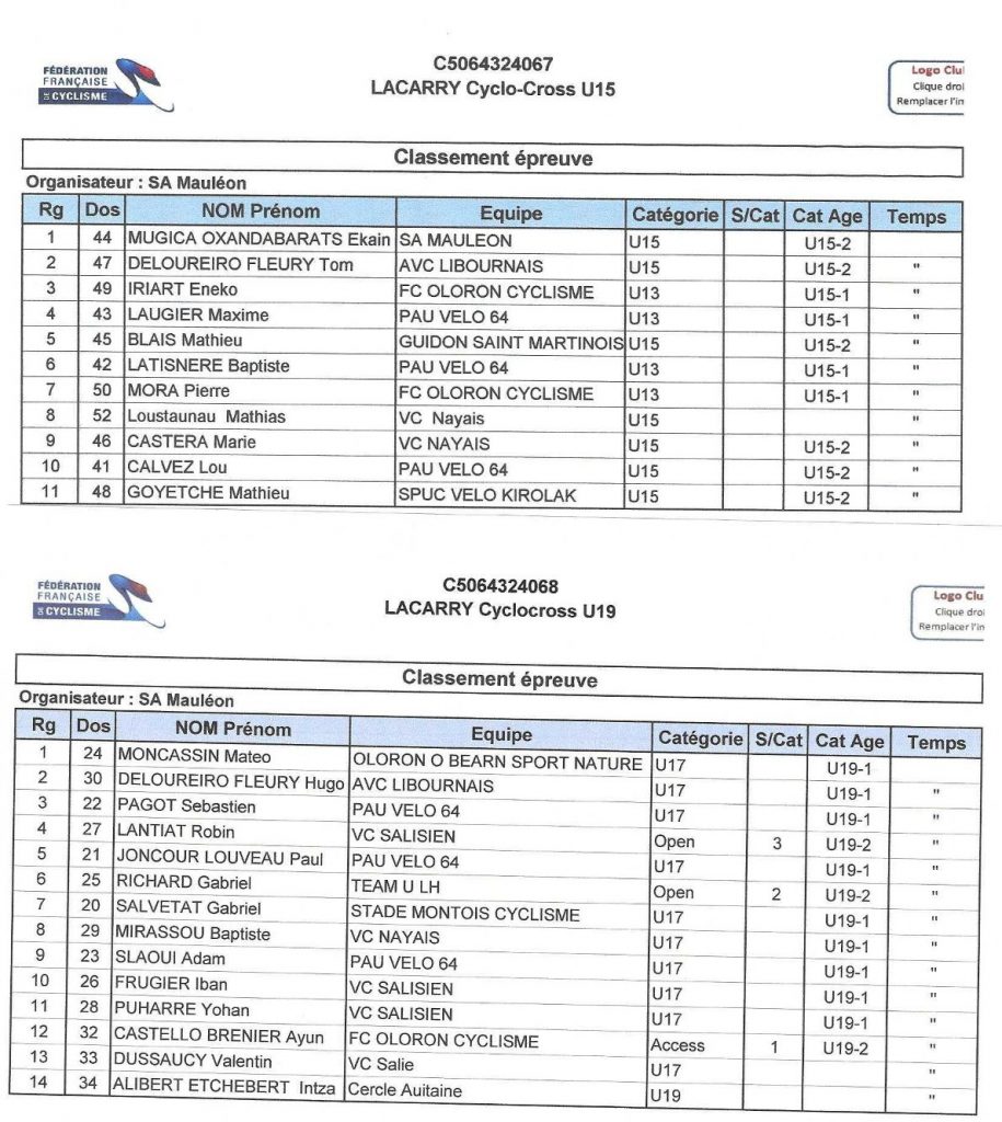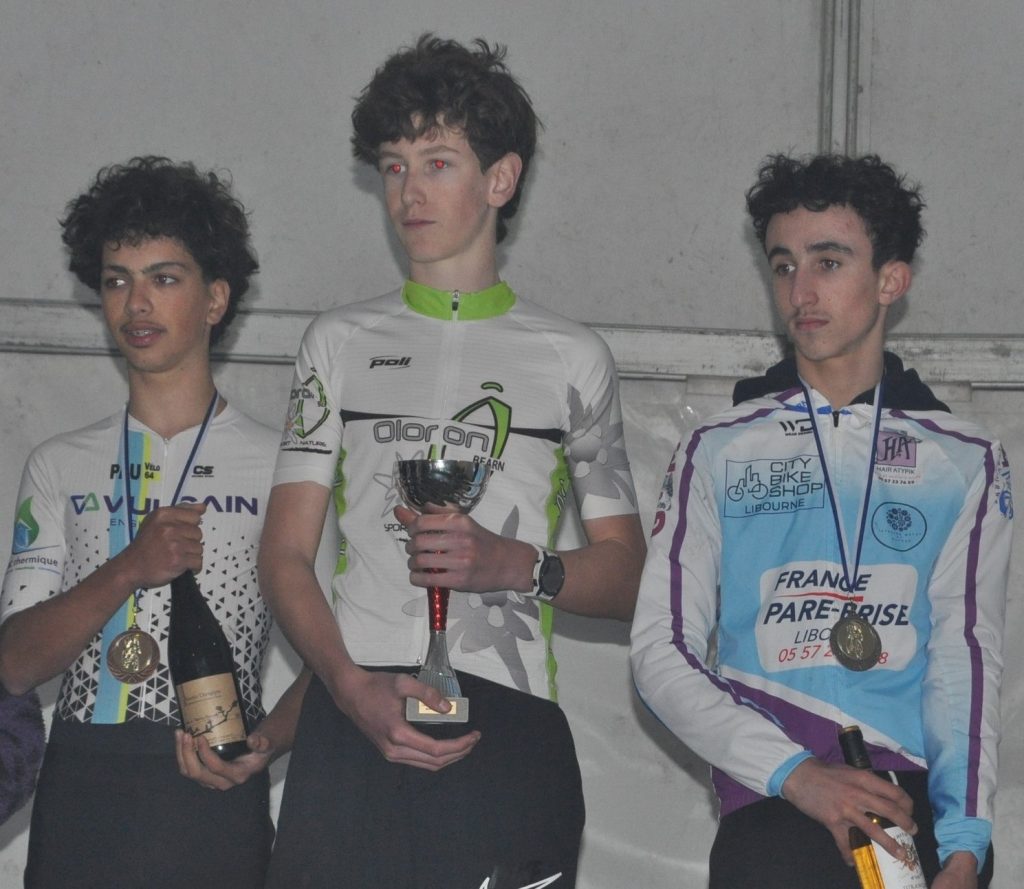 U 15 : 1er Ekain Mugica Oxandabarats (SA Mauléon), 2èTom FleuryDeloureiro (Libourne), 3è Eneko Iriart (FC Oloron) en féminines : 1ere Marie Castéra (VC Nay) 2è Lou Calvez (Pau V64)