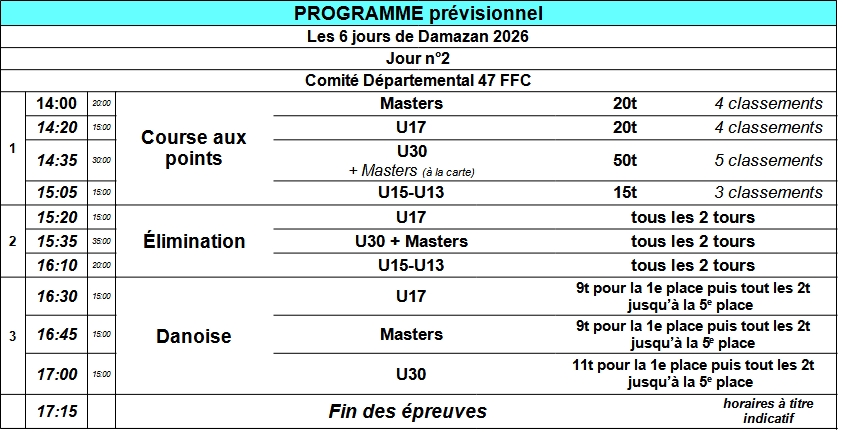 Horaires : Ouverture des portes à 11h. Début des épreuves à 14h00 (Permanence au vélodrome de 13h00 à 13h45).