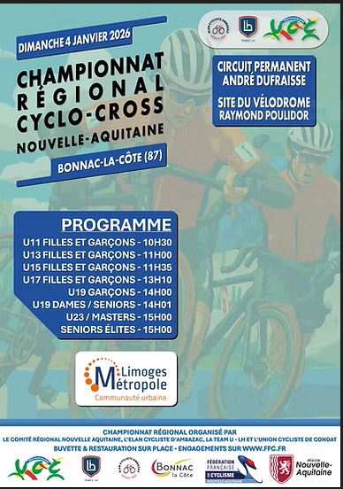 Le championnat régional Nouvelle Aquitaine de cyclo-cross est organisé par le Comité Régional Nouvelle Aquitaine, l’Elan Cycliste d’Ambazac, la Team U – LH et l’Union Cycliste de Condat à Bonnac-la-Côte sous le règlement de la F.F.C.