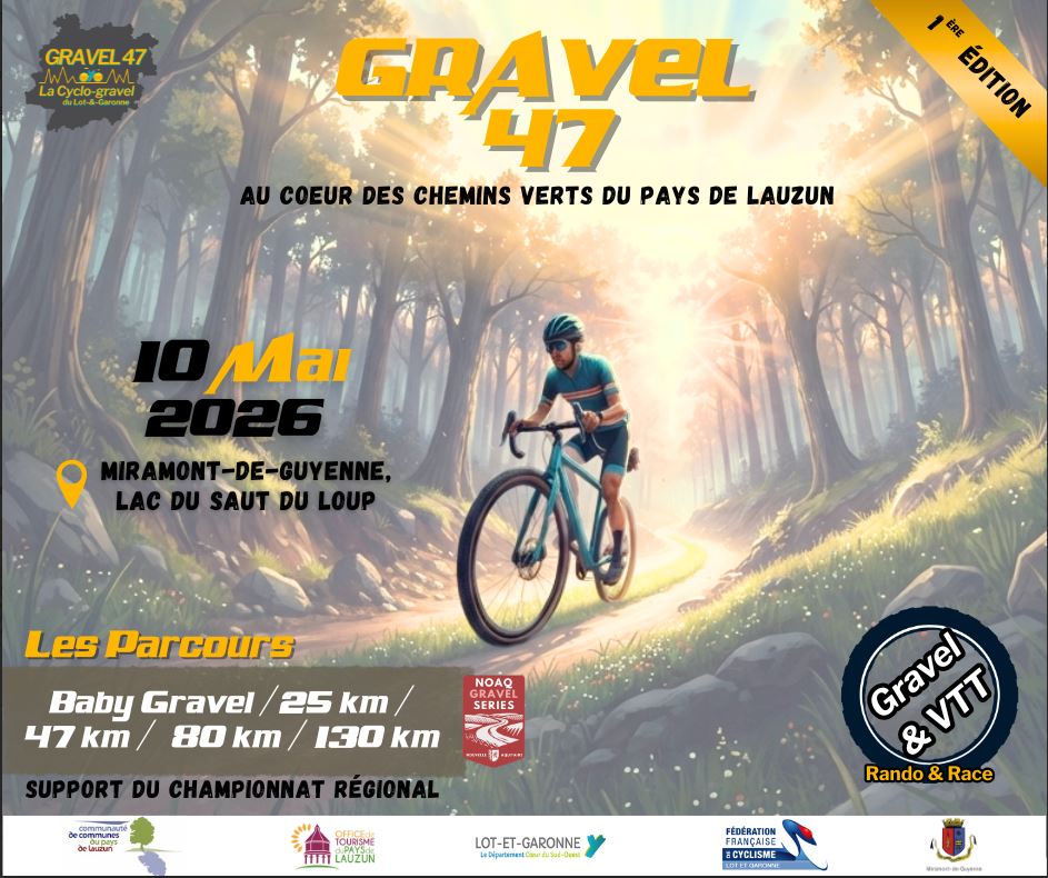 Après le succès attendu du Défi 47 le 12 avril prochain, le Comité de Lot-et-Garonne de Cyclisme (CD47) vous donne rendez-vous pour un deuxième temps fort de la saison : le GRAVEL 47 « Au cœur des chemins verts du Pays de Lauzun ».