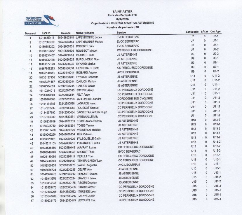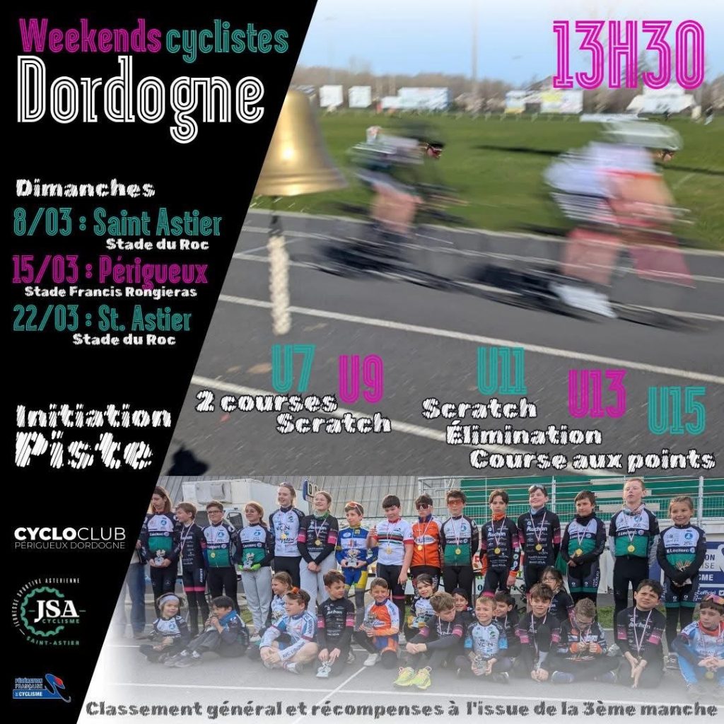 Dimanche 8 mars : Week-end cycliste pour les jeunes U7 aux U 15 à St Astier