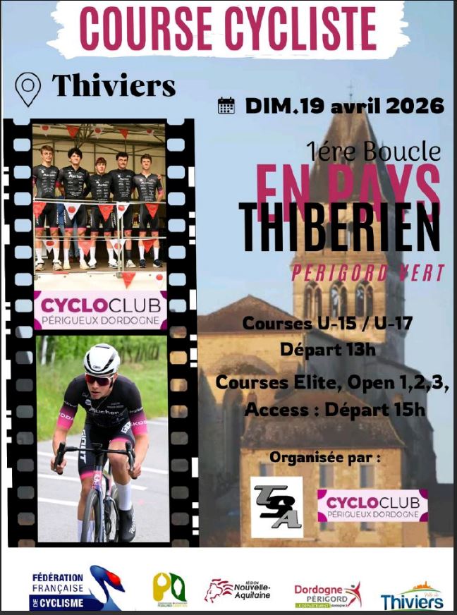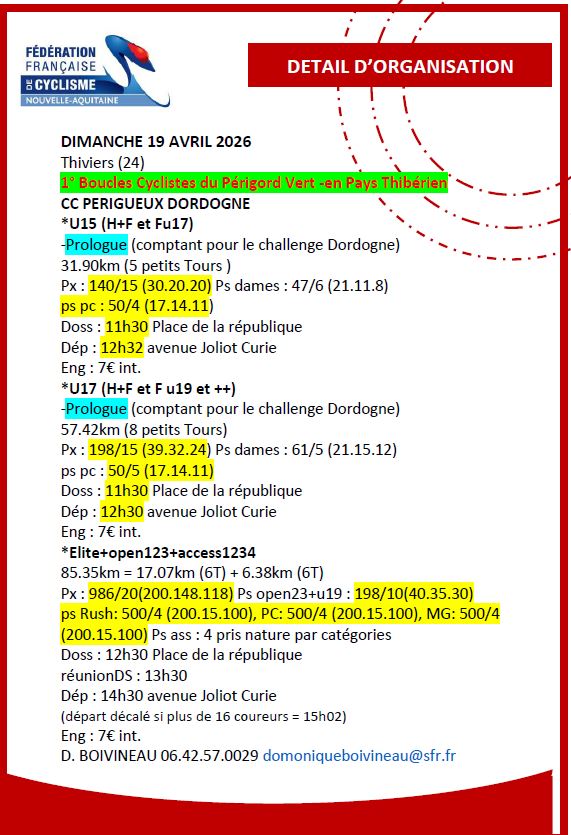 - Pour les épreuves de Thiviers, départ des U17 et dames à 12 h 30, pour 8 tours, 15 prix scratch, plus prix spéciaux pour les dames, plus classement Rush.