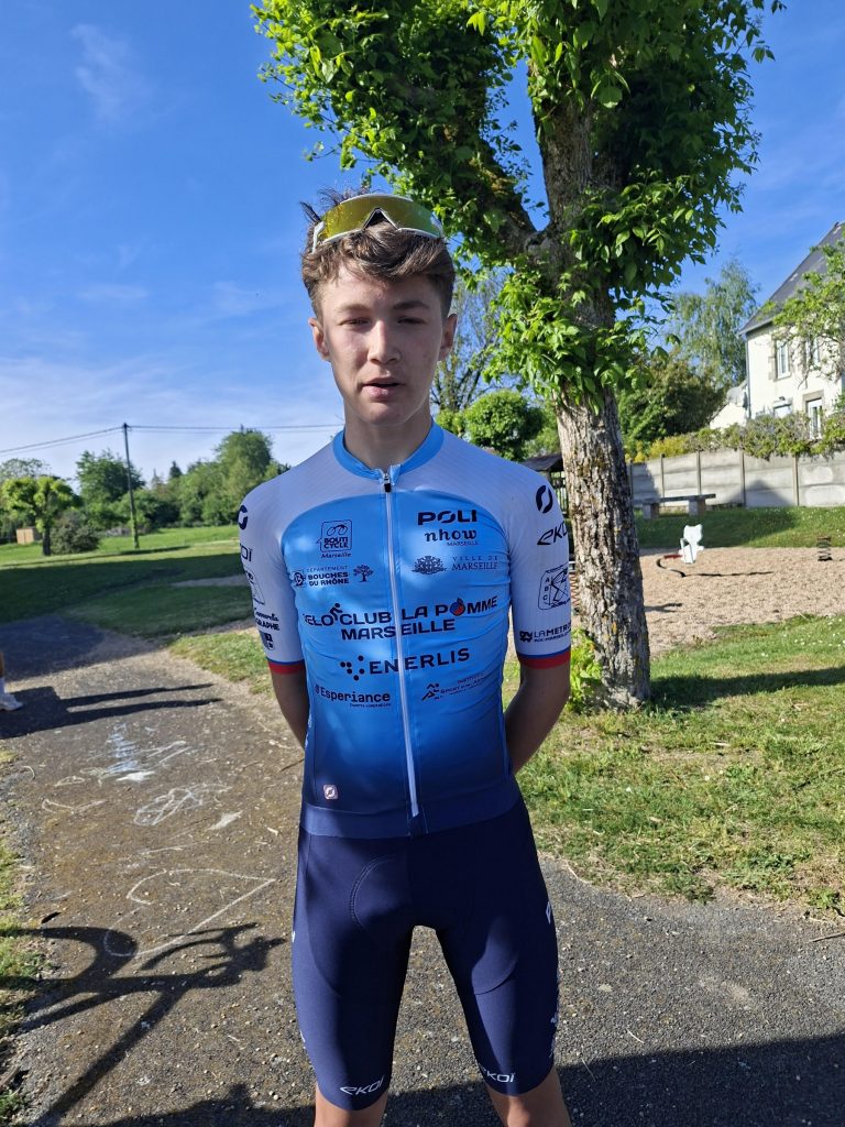 Pour l’étape de l’aprés midi en U15 dès le premier tour les favoris et 1 autre sont légèrement devant .Mais la fugue fut de courte durée et lors du 2ème tour couvert à allure modérée , nous avons cru a un moment que nous allions assister à un enterrement mais lors de l’amorce du dernier tour ,le tueur au sang froid Maxime Mignon accélérera l’allure. Maxime est parti pour gagner la 2ème étape et bien sur prendre le maillot de leader . Il sera très très dur de l’en déloger .Il devance Merlin Russeil et Evann Pezzoli . A noter le belle 5ème place du Marseillais Mika Leroux Saloum qui prend la 5eme place au général après avoir terminer 5eme le matin et 6eme l’après midi .Il prend le maillot de 1er des premiers année .